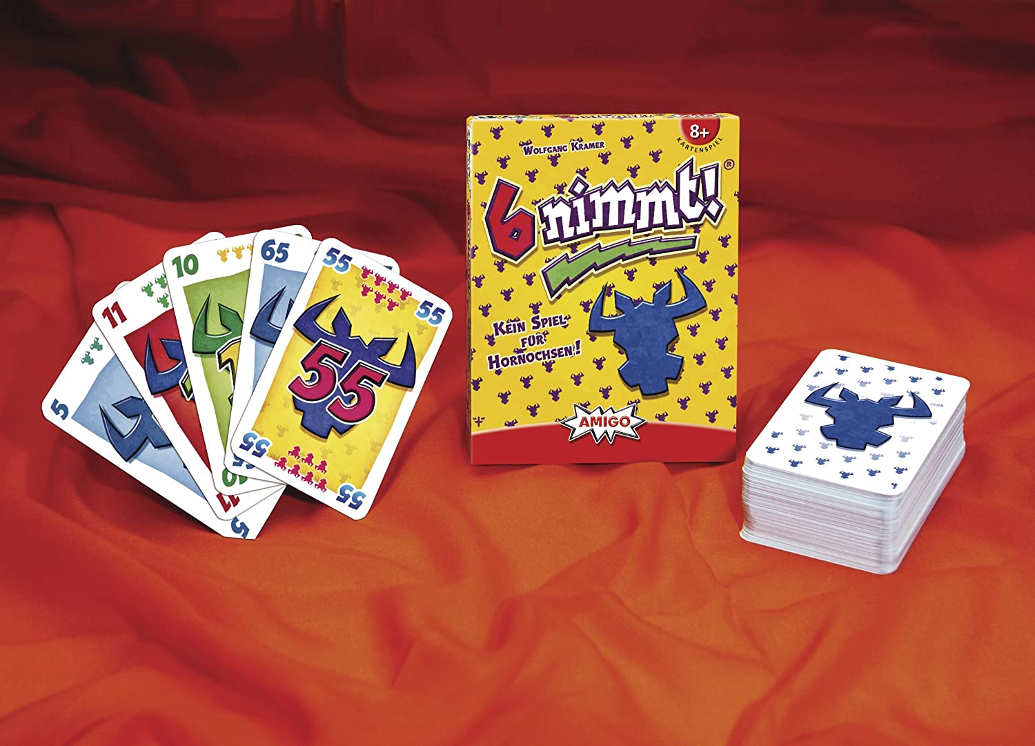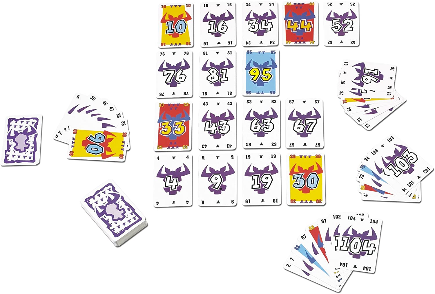 You start with 10 cards, ranked between 1 and 104. Each round, you must add a card to one of 4 active rows. If you play the 6th card in a row, you must take the first 5 cards in that row. This is not a good thing! You get penalty points for each bull head on these cards. The player with the least bull heads wins. A quick, fun, fast-paced game for young and old.