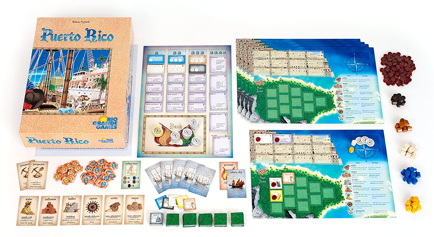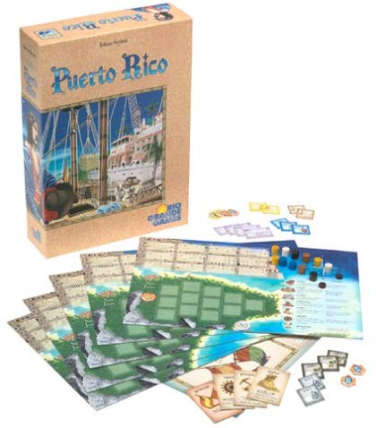 Cada jugador utiliza diferentes roles: mayordomo, capitán, colono, comerciante, explorador, artesano o constructor para obtener la mayor cantidad de puntos de victoria con su colonia. Los jugadores pueden actuar en cada turno del juego, permitiéndoles elegir entre enviar productos por puntos o construir una ciudad impresionante. Los jugadores deben administrar a sus colonos, erigir una variedad de edificios, construir su plantación y vender o enviar bienes. Con docenas de opciones, Puerto Rico es un juego optimizado que se puede jugar en aproximadamente una hora y puede manejar hasta cinco jugadores.