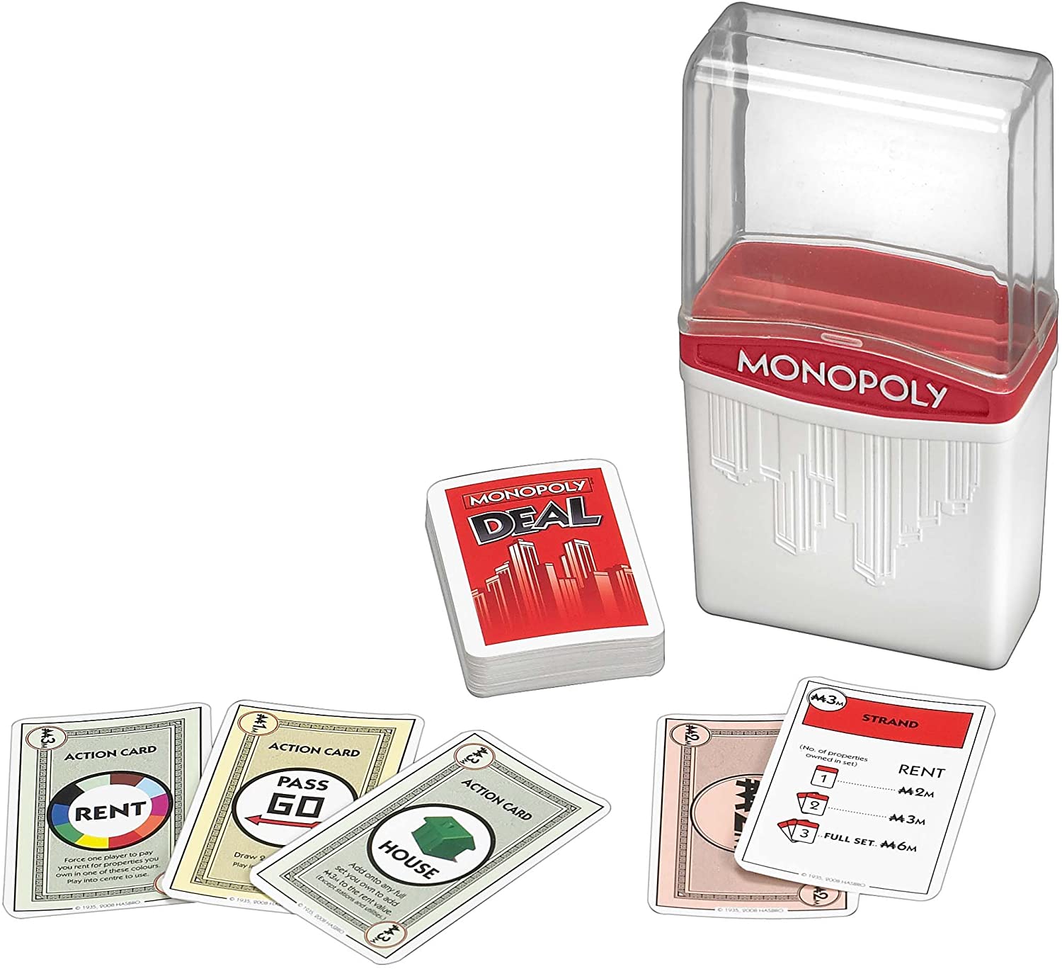 This Monopoly Deal version features the inclusion of the Shuffle Shaker, which takes the trouble out of the shuffle as it out-shuffles the human hand! MONOPOLY Deal is the fast-paced, addictive card game where your luck can change in the play of a card! Collect three complete property sets, but beware of Debt Collectors, Forced Deals and the dreaded Deal Breakers, which could change your fortunes at any time! For 2 - 4 players, ages 8 and up.