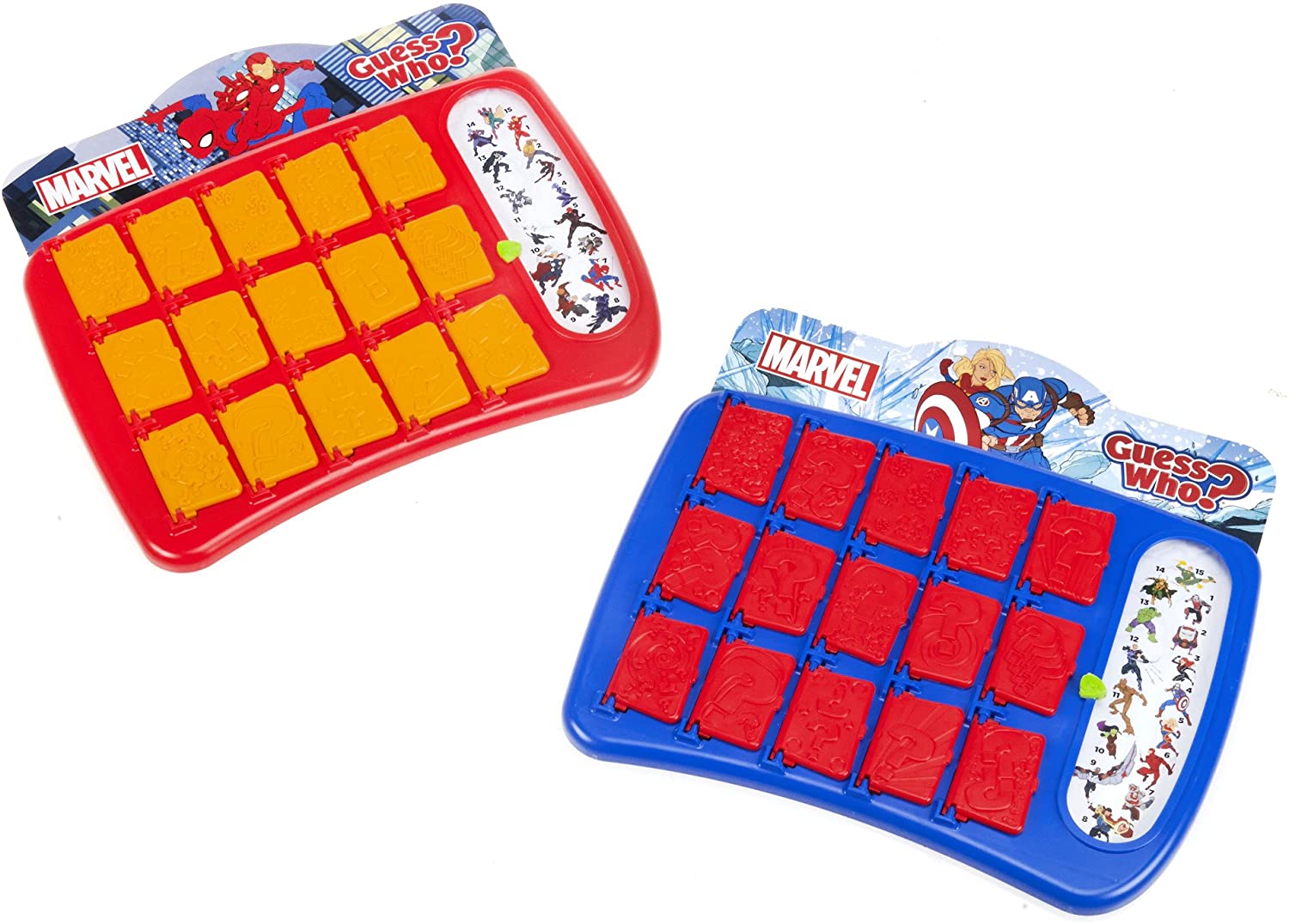 It's the popular Guess Who? game featuring Super Heroes and Super Villains from the Marvel Universe! Each player chooses a mystery character -- it could be Spider-Man, or one of his friends or foes. Kids can have lots of fun as they ask yes or no questions to figure out each other's mystery character. Players can ask questions like "Is your character wearing a mask?" or "Does your character have long hair?" The game starts out with a full tray of characters, and with each answer, more characters are eliminated -- narrowing down the possibilities. The first player to figure out their opponent's mystery character wins the game! Copyright Marvel. Hasbro Gaming and all related terms are trademarks of Hasbro.